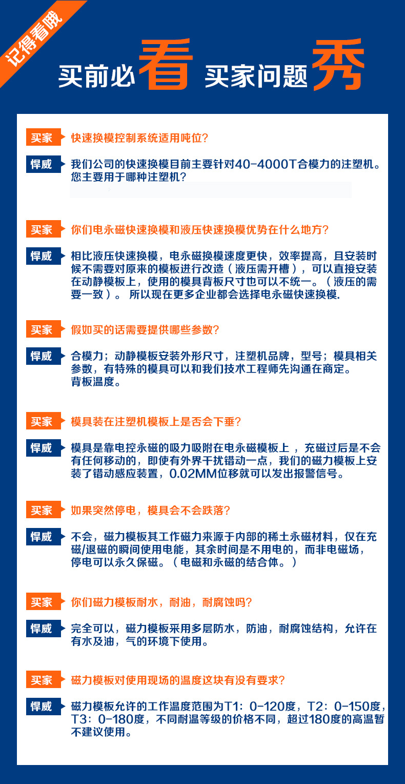 悍威磁電有多年從事電永磁相關(guān)產(chǎn)品研制的經(jīng)驗(yàn),其電永磁快速換模系統(tǒng)完全按照國際標(biāo)準(zhǔn)設(shè)計(jì)制造,精益求精,整套系統(tǒng)的性能、質(zhì)量和安全保護(hù)裝置毫不遜色于國際知名品牌,適用于50噸—3200噸注塑機(jī)使用。